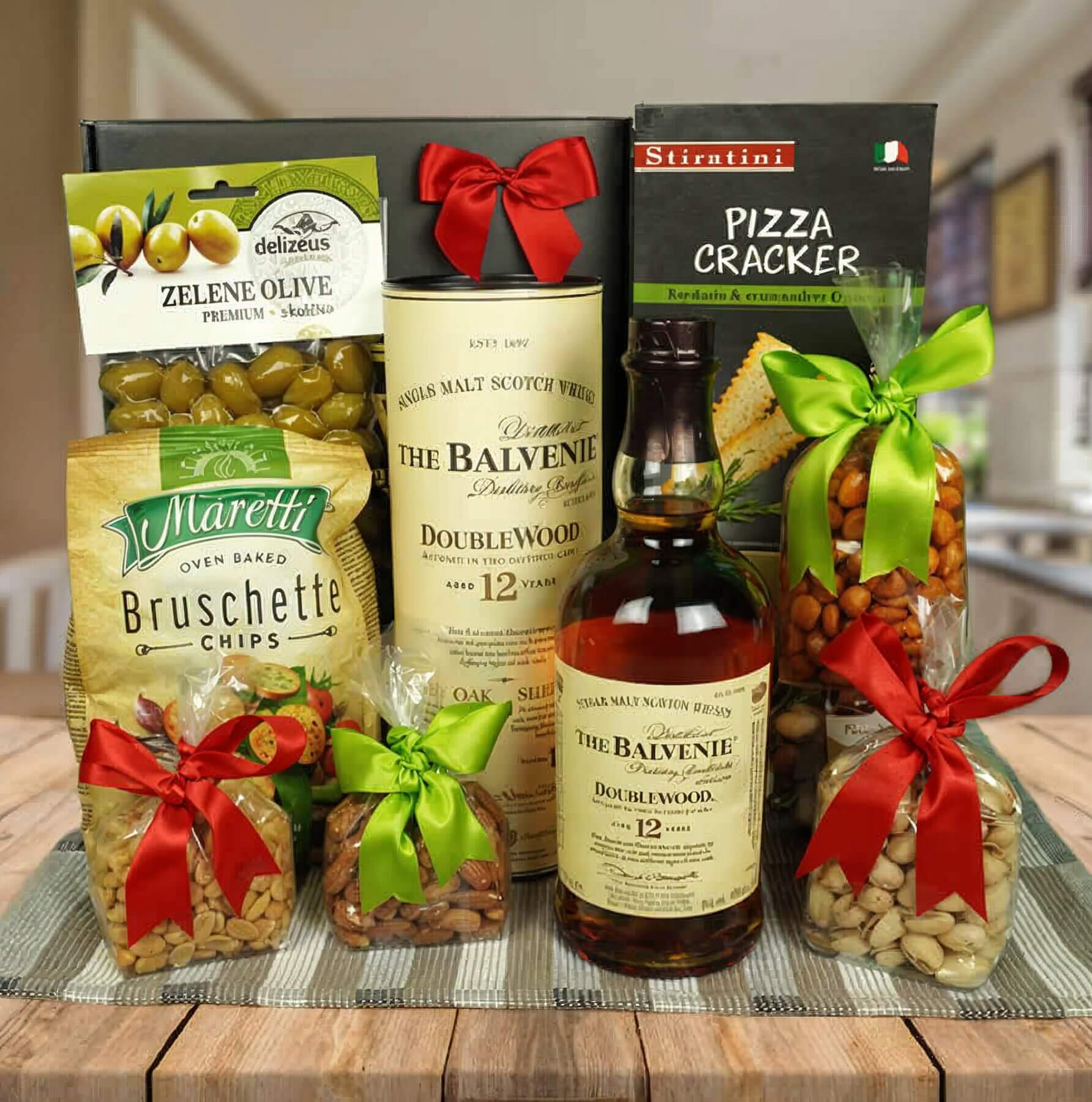 Enjoy a sophisticated tasting experience with our Balvenie 12-Year Double Wood Whisky Tasting Experience Basket. Discover the rich and nuanced tastes of Balvenie 12-Year Double Wood Whisky, expertly paired with a tempting set of gastronomic pleasures.