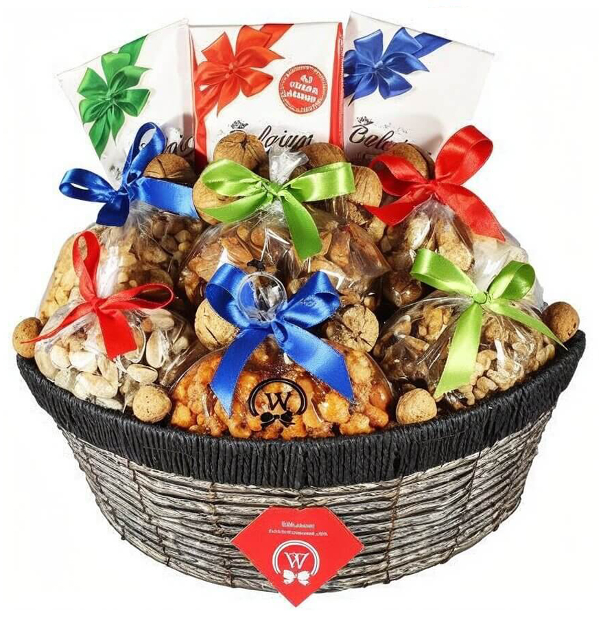 With these Blessings All Around Gift Basket choices, this basket is filled with almonds, Picante corn, walnuts, pistachio, peanuts, and chocolates.