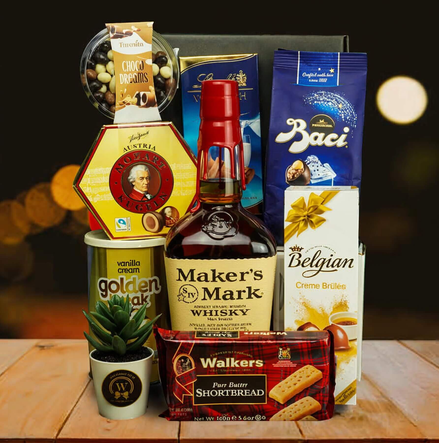 This collection features the distinguished Maker’s Mark Bourbon (700ml), an exceptionally smooth and well-crafted bourbon. Indulge in the exquisite Mozart Kugeln and the velvety Chocolate Bag. Savor the artisanal Bonbonniere and experience the delicate crunch of Wafer Rolls. Delight in the buttery richness of Walkers Shortbread and the irresistible combination of Favorita Chocolate Peanuts or Hazels.