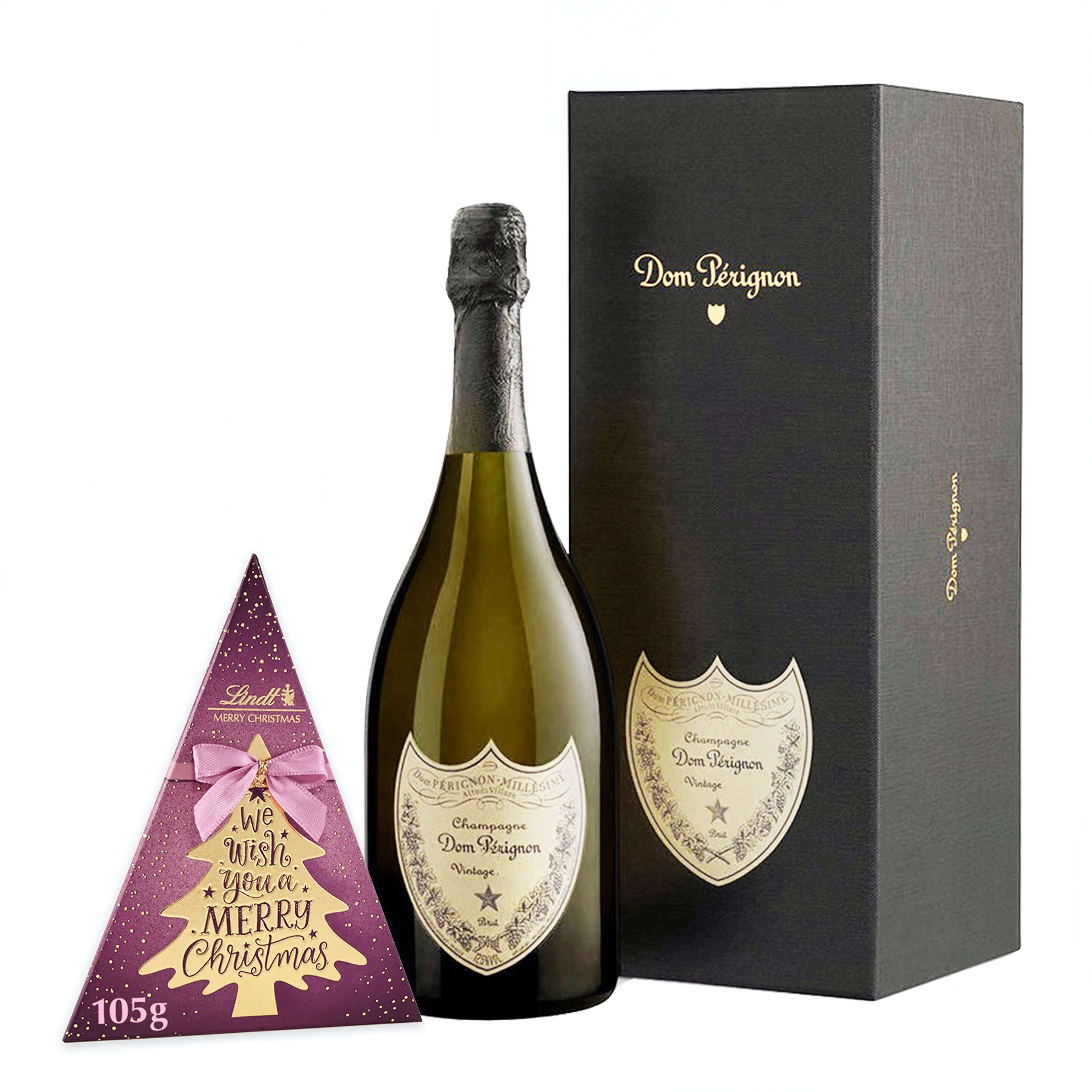 A single bottle of Dom Pérignon champagne 750ml, together with a Christmas Lindt Bonbonniere, 105 g (3.7 oz), presented in nice decoration.