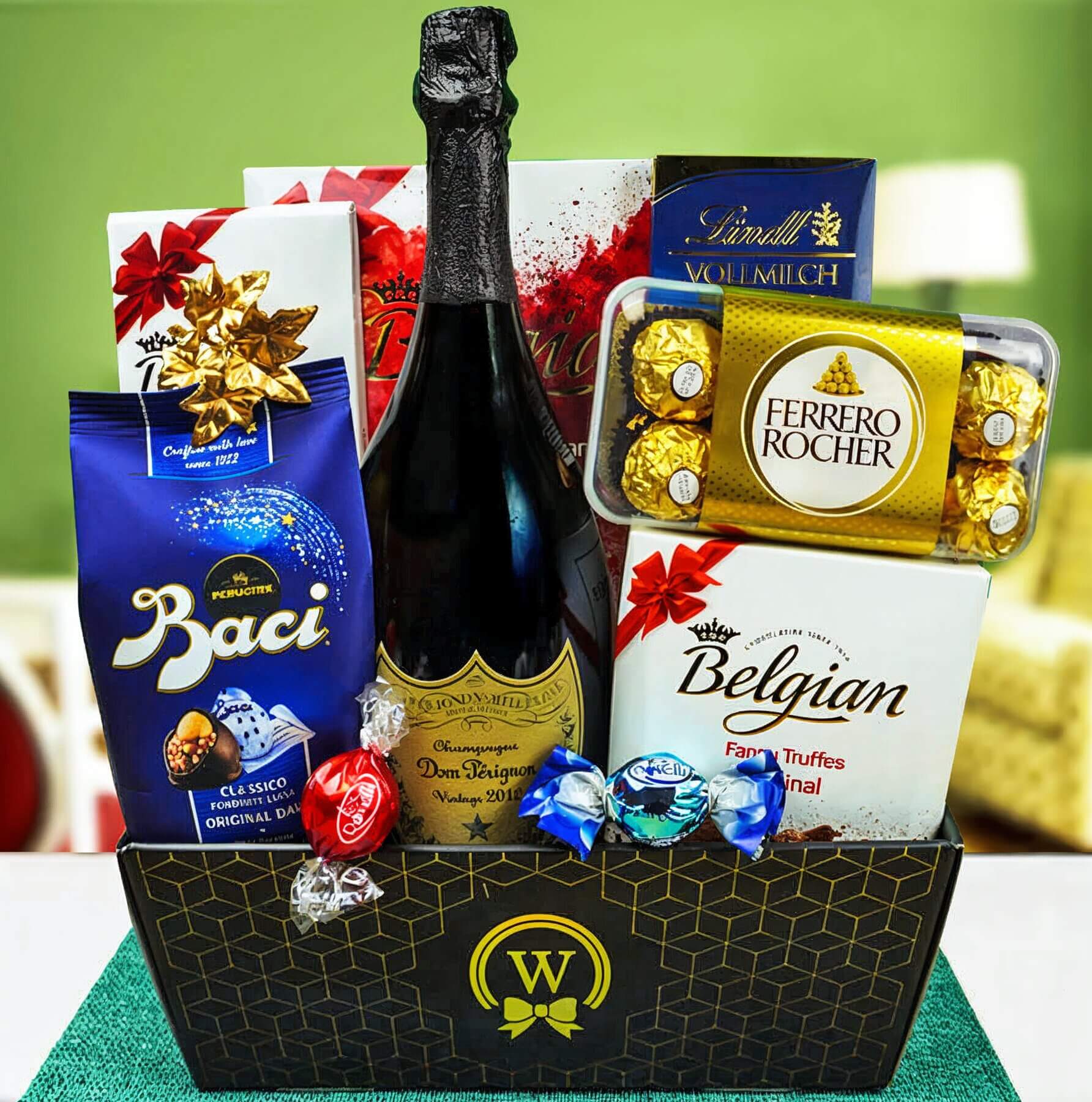 Luxurious and stunning gift basket especially for those who understand what quality is. Decorative basket with top European chocolates And Dom Perignon Champagne.