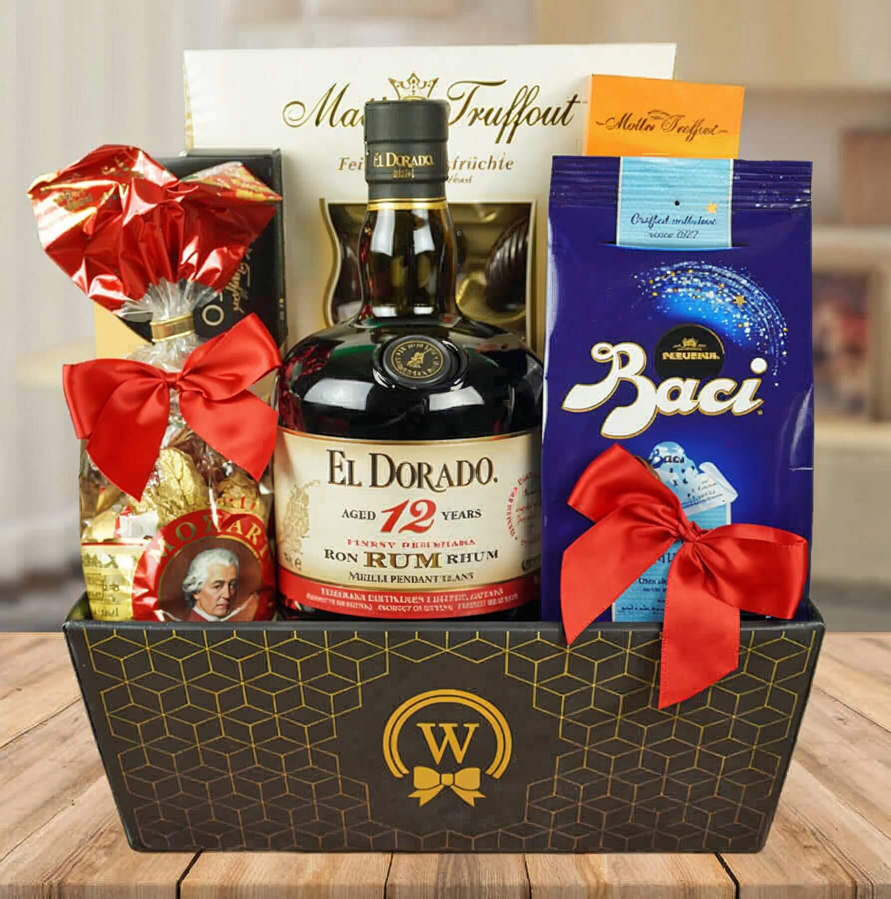 Savor the sophistication of our El Dorado 12-Year Reserve GoldenLegacy Gift Basket, a treasure trove of indulgence and elegance. Delight in the rich complexity of El Dorado Rum, aged for 12 years to perfection, alongside an exquisite array of gourmet delights.