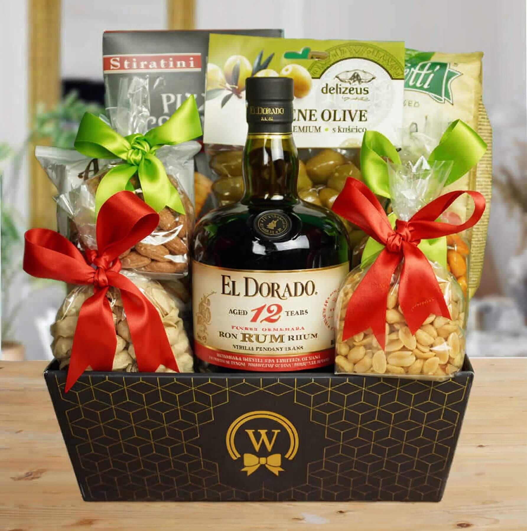 Savor the mouthwatering tastes of our El Dorado 12-Year Reserve Savory Delights Basket. This opulent set includes El Dorado Rum, aged for 12 years to perfection, alongside a tantalizing selection of savory treats.