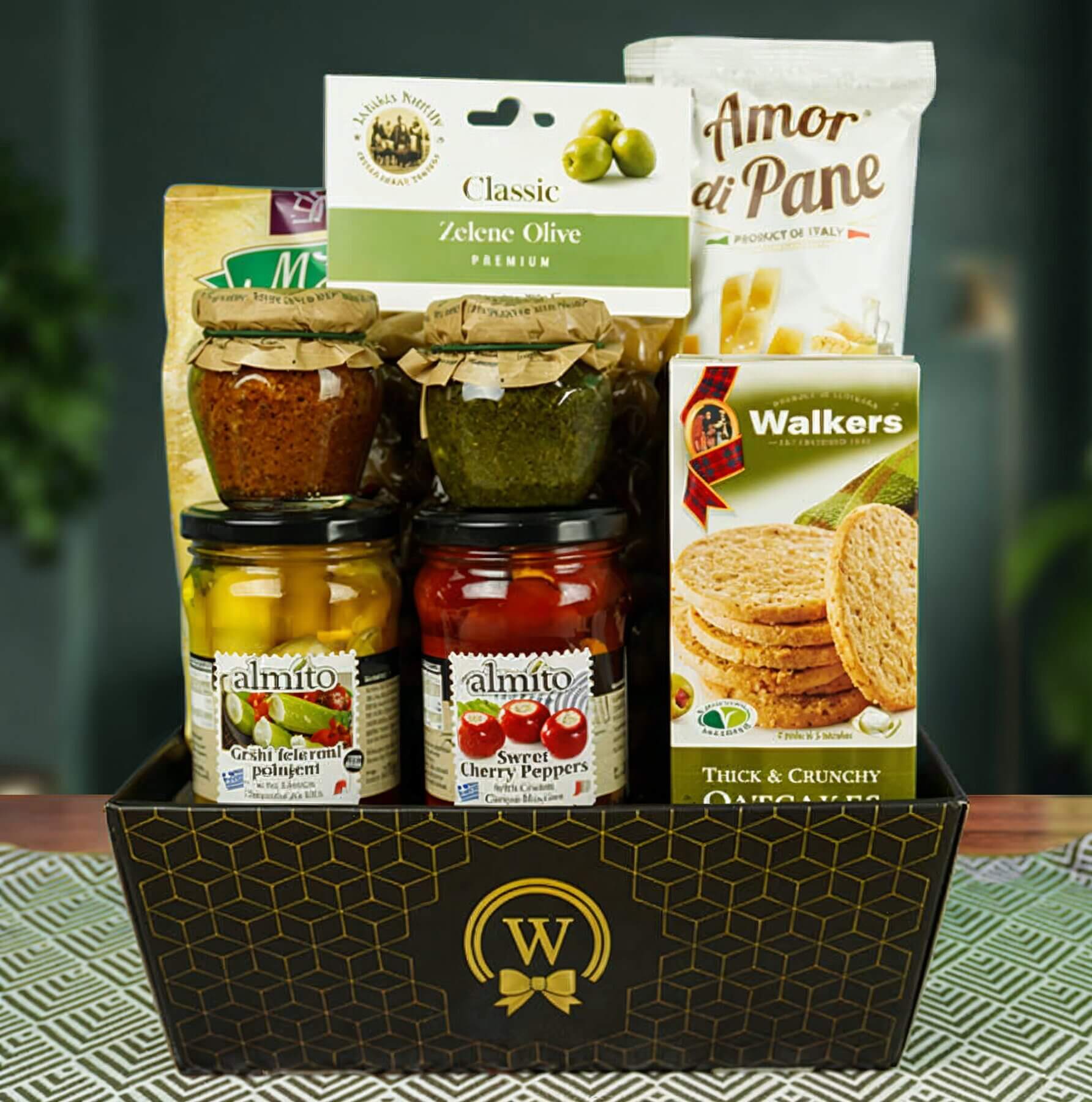 Experience the richness of Pate di Olive Verdi, the velvety Crema di Pomodori, and the crispy texture of Bruschetta. Delight in the briny perfection of Greek Olives and the satisfying crunch of Grissini. Presented on our Walwater’s Gift Tray, this collection invites you to savor a harmonious blend of gourmet savors that will delight any food enthusiast.