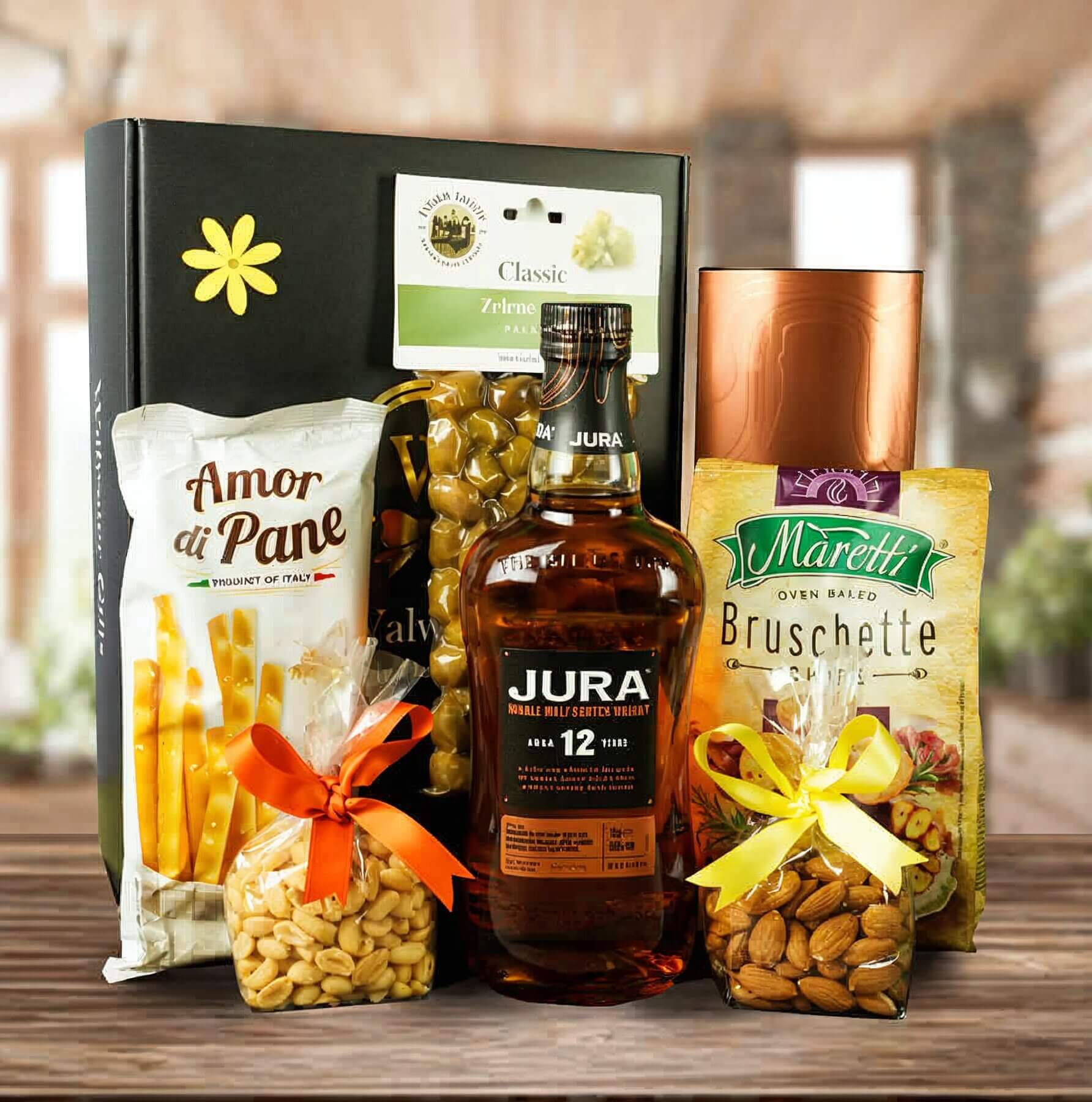 Experience the exquisite flavors of Jura 12 Years Single Malt Whisky with our Jura Elixir gift basket. Indulge in the smooth, smoky notes of this distinguished whiskey as it takes center stage in a symphony of gourmet delights. Discover the crisp and savory delights of Grissini and Bruschetta, perfect for pairing with the rich flavors of the whiskey.