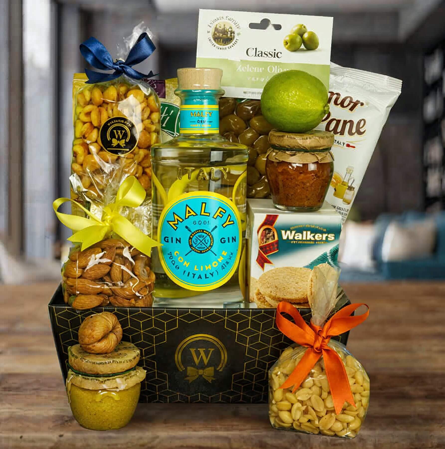 This exquisite selection features a bottle of Malfy Gin Con Limone, perfectly complemented by a variety of gourmet treats. From crispy Grissini and savory Bruschetta to wholesome Walkers Oatcakes and delightful nut assortments, every bite is a burst of zesty delight.