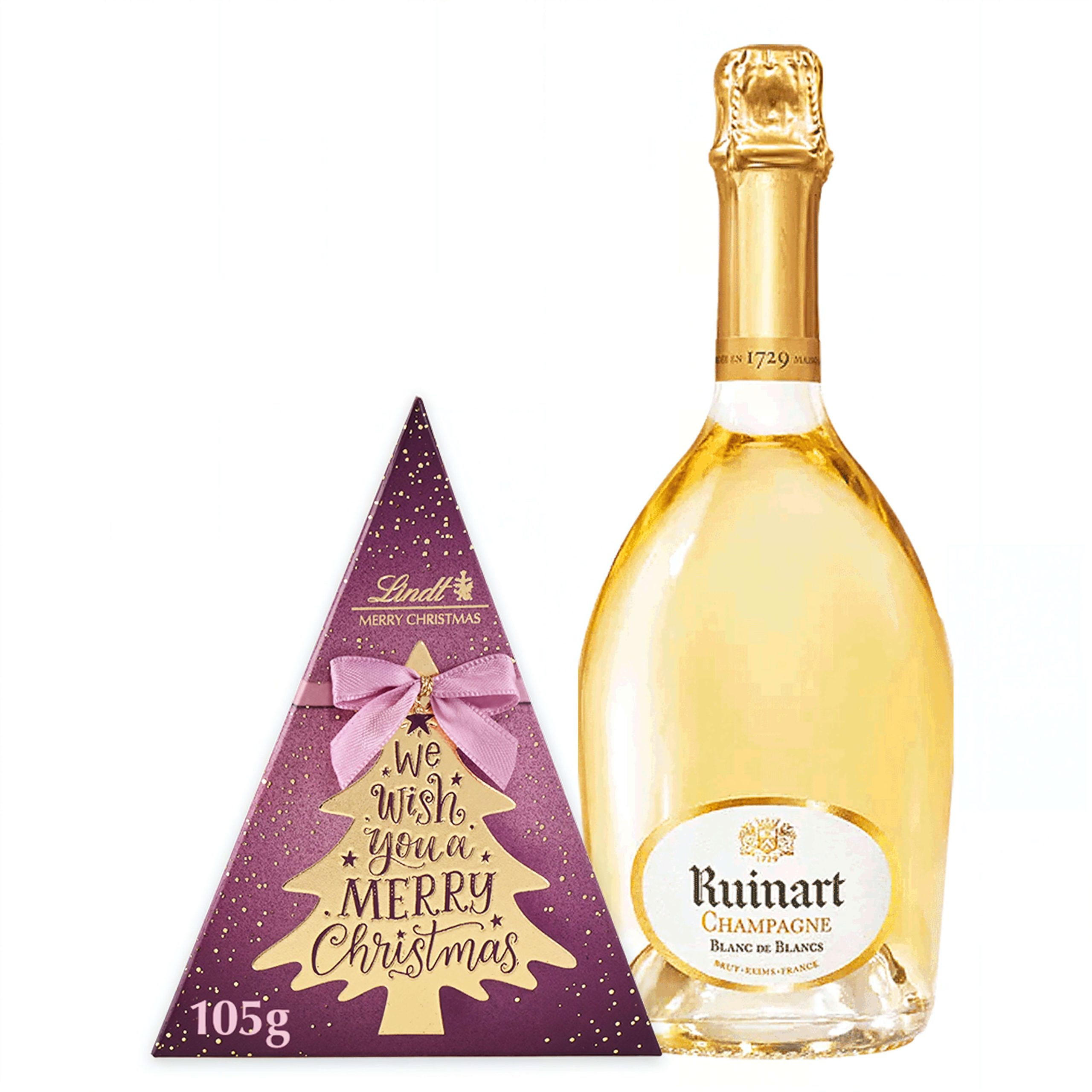 A single bottle of Ruinart Blanc de Blancs champagne 750ml, together with a Christmas Lindt Bonbonniere 105 g (3.7 oz), presented in nice decoration.