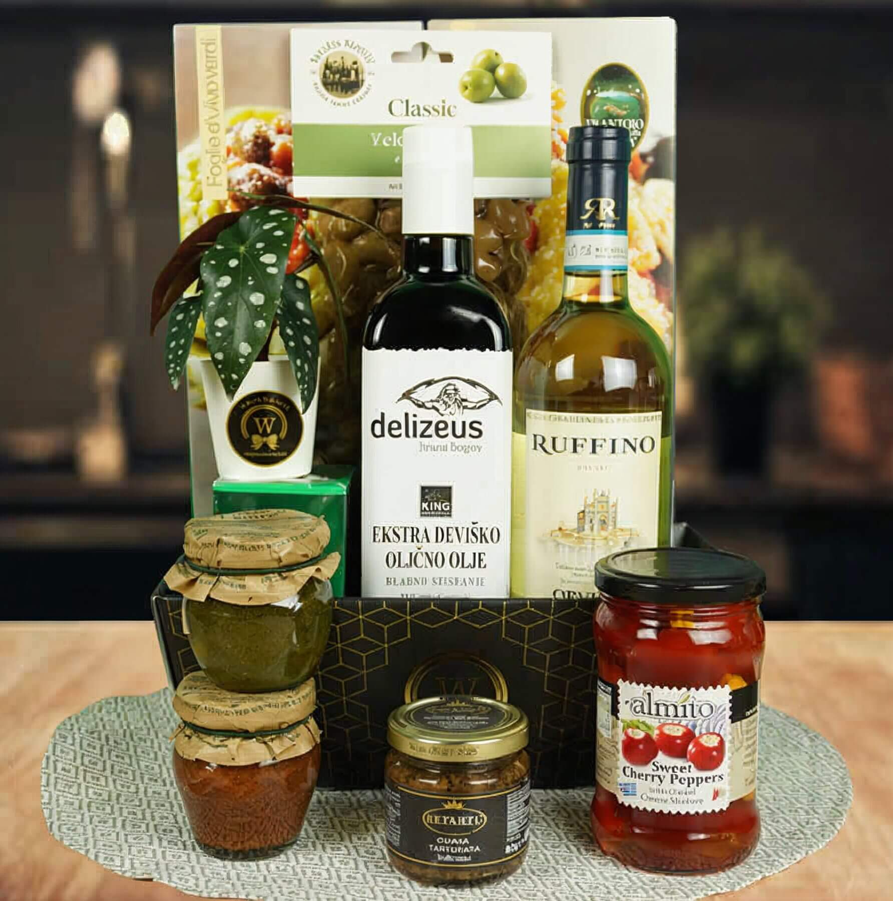 Indulge in the tangy sweetness of Sweet Cherry Peppers, the luxurious Truffles Sauce, the aromatic Italian Ligure Pesto, and the velvety Italian Ligure Crema di Pomodori. Complete the experience with the briny perfection of Greek Olives, elegantly presented on our Walwater’s Gift Tray. Get ready for a Mediterranean feast that will delight the senses.