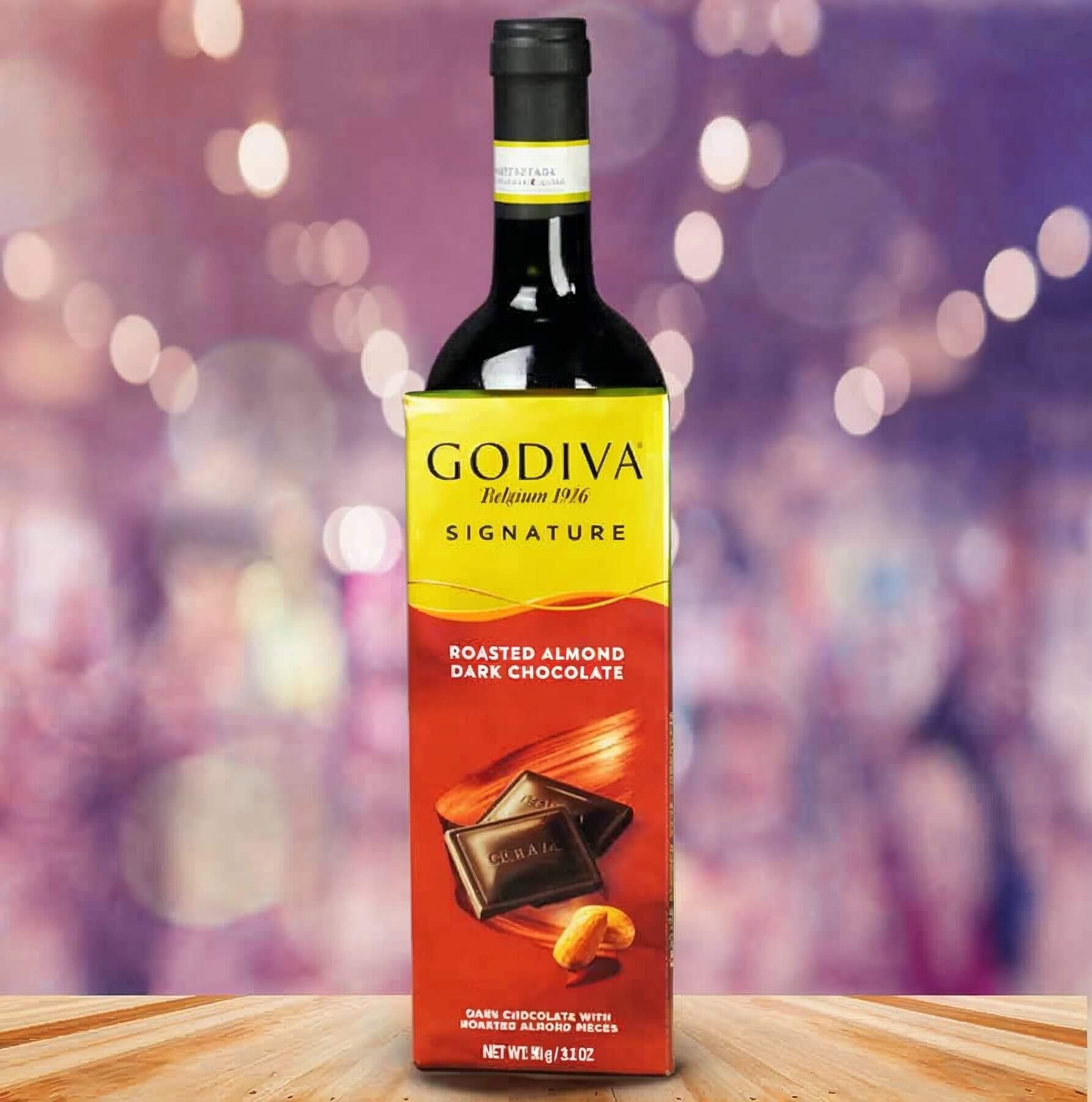 A single bottle of Red Wine 750ml together with Godiva Chocolate 90 g / 3.1 Oz is presented in nice decoration.