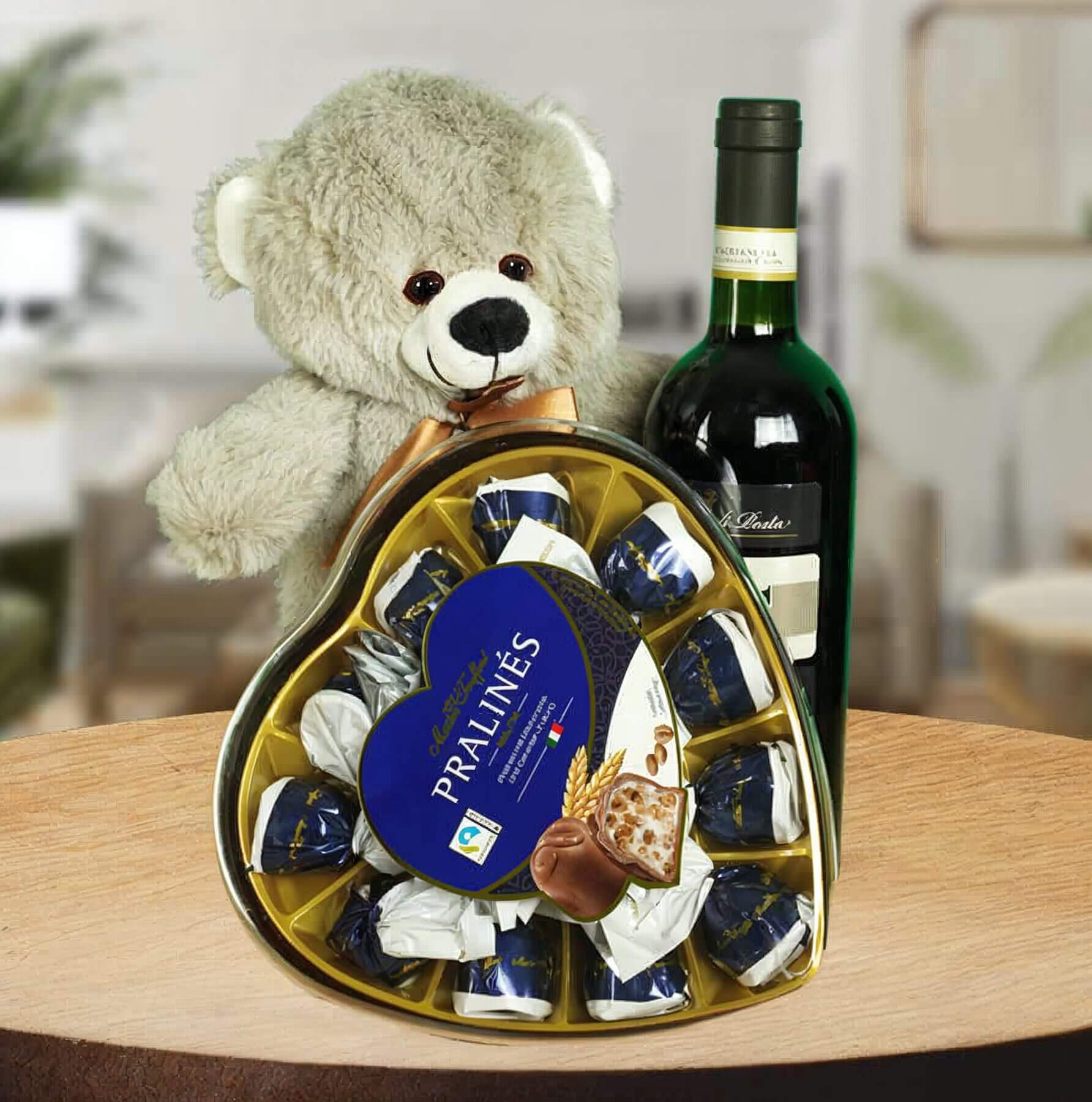 Elevate your romantic gestures with our Red Wine Romance Teddy Bear Ensemble. This charming hamper features a bottle of velvety Red Wine, perfect for intimate evenings shared with loved ones.