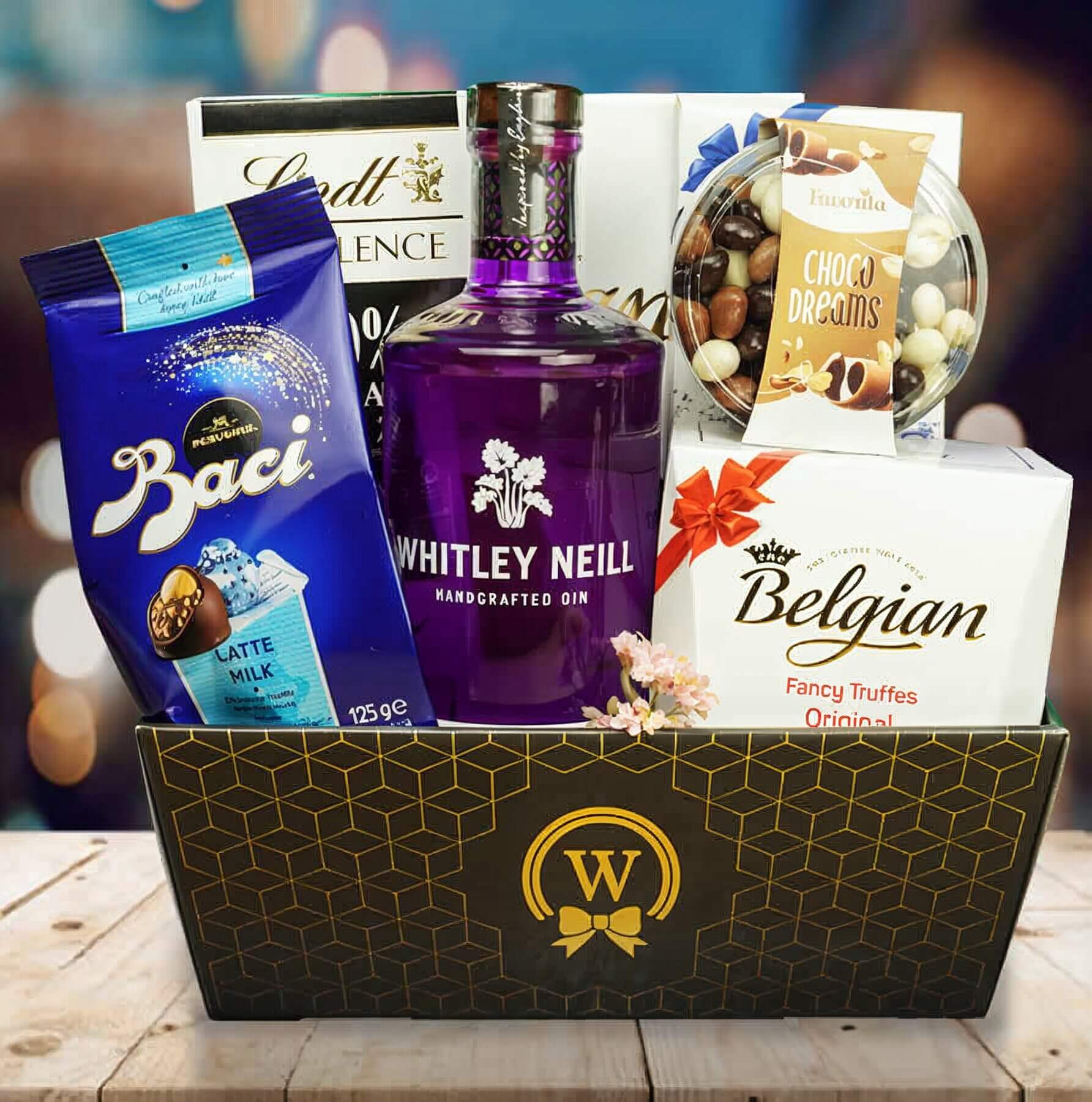 Enjoy the flavors of Rhubarb Gin Delight with our gift basket. Discover a gourmet range of exquisite chocolates and treats that will tantalize your taste buds. Savor the delightful combination of the tangy and sweet Rhubarb Gin, paired perfectly with luxurious Belgian bonbons, delectable truffles, and premium chocolate bars.