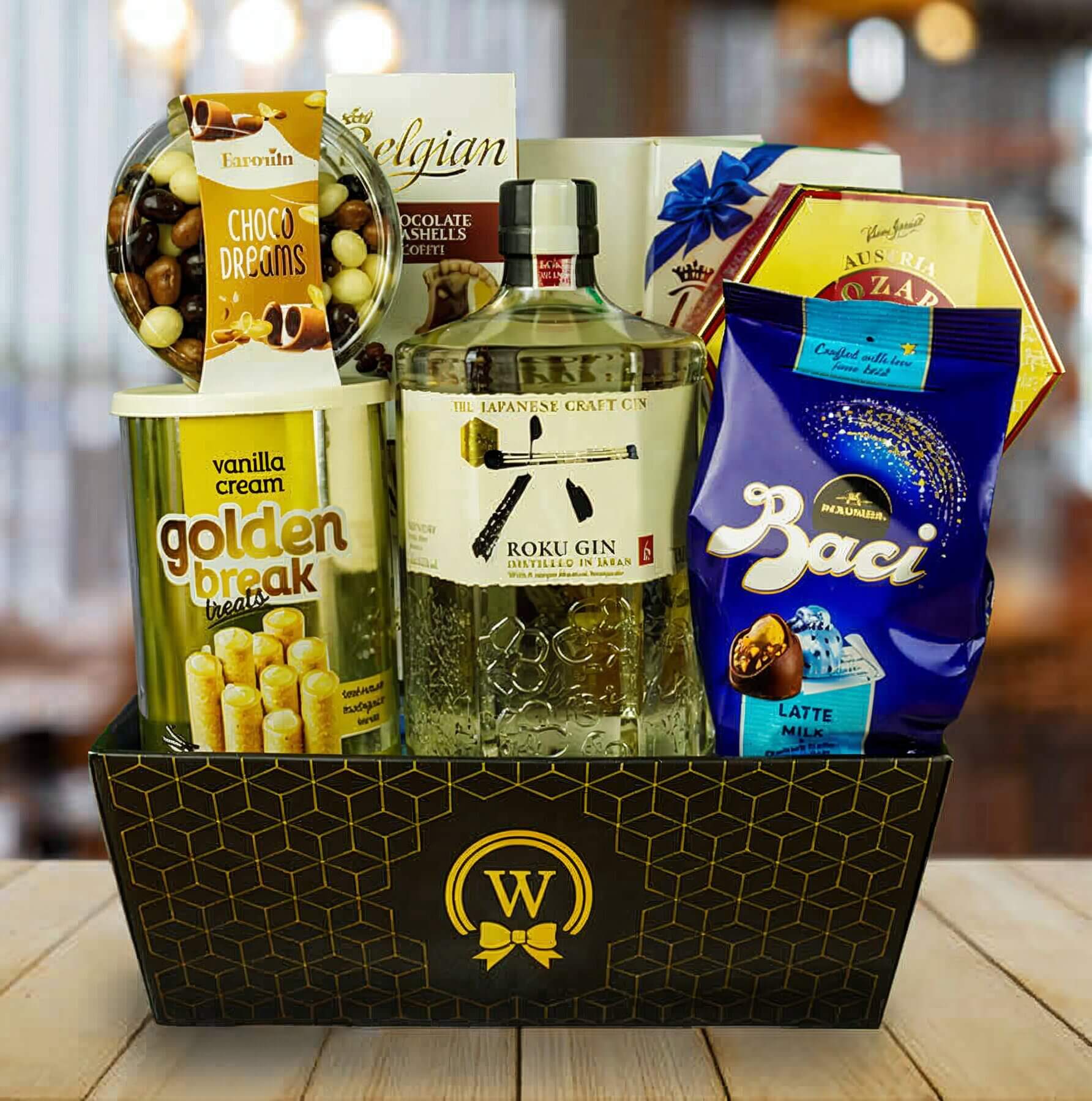 Embark on a journey of discovery with Roku Japanese Craft Gin, meticulously crafted with the perfect fusion of botanicals for a harmonious taste. Get pampered with in an assortment of decadent treats, including a Chocolate Bag, Bonbonniere, Wafer Rolls, Favorita Chocolate Peanuts/Hazels, and a Chocolate Bar.