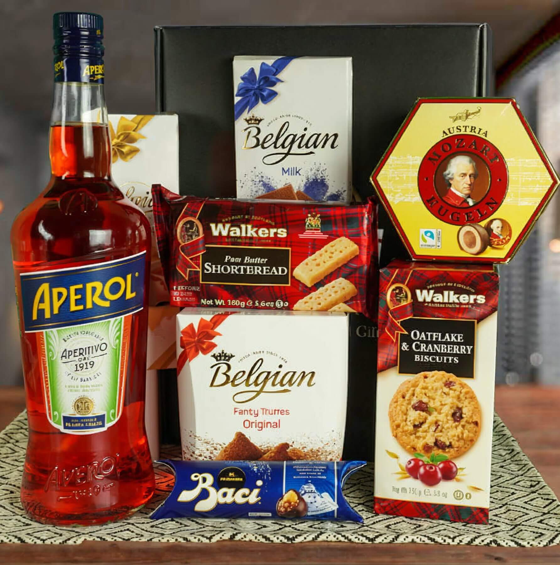 Experience a fusion of indulgence with our “Sweet Experience of Aperol” gift set. Savor the iconic Aperol, perfectly paired with the exquisite flavors of Mozart Kugeln, Baci Tube, Belgian Chocolate Bar, Belgian Bonbons, Walker Cookies, Walker Shortbread, and Belgian Truffles.